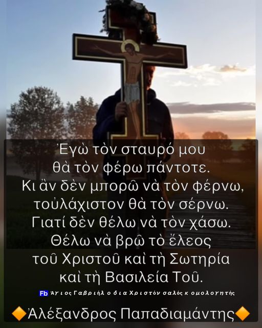 Ἐγὼ τὸν σταυρό μου θὰ τὸν φέρω πάντοτε. Κι ἂν δὲν μπορῶ νὰ τὸν φέρνω, τουλάχιστον θὰ τὸν σέρνω. Γιατί δὲν θέλω νὰ τὸν χάσω. Θέλω νὰ βρῶ τὸ ἔλεος…