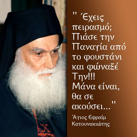 ~ΟΣΙΟΣ ΕΦΡΑΙΜ ΚΑΤΟΥΝΑΚΙΩΤΗΣ: Έχεις πειρασμό;Πιάσε την Παναγιά από το φουστάνικαι φώναξε Την!Μάνα είναι, θα σε ακούσει..Το έλεγε έτσι χαριτολογώνταςαλλά και με πίστη ότι έτσι θα γίνει…Ότι ζητούσε από την Παναγία,Εκείνη…
