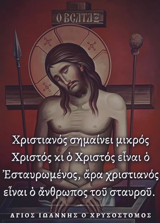 Χριστιανός σημαίνει μικρός Χριστός κι ὁ Χριστός εἶναι ὁ Ἐσταυρωμένος, ἄρα χριστιανός εἶναι ὁ ἄνθρωπος τοῦ σταυροῦ. Άγιος Ιωάννης ο Χρυσόστομος