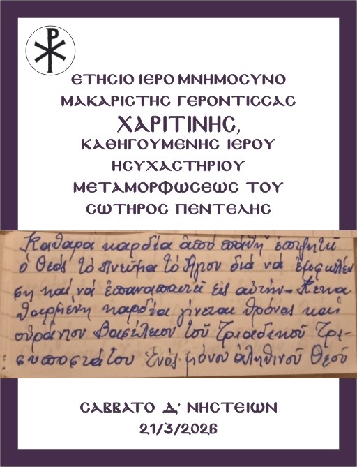 +ΕΤΗΣΙΟ ΙΕΡΟ ΜΝΗΜΟΣΥΝΟ ΜΑΚΑΡΙΣΤΗΣ ΓΕΡΟΝΤΙΣΣΑΣ ΧΑΡΙΤΙΝΗΣ, ΗΓΟΥΜΕΝΗΣ ΙΕΡΑΣ ΜΟΝΗΣ ΜΕΤΑΜΟΡΦΩΣΕΩΣ ΤΟΥ ΣΩΤΗΡΟΣ ΠΕΝΤΕΛΗΣ.+ΣΑΒΒΑΤΟ -Δ’ ΝΗΣΤΕΙΩΝ- 21/3/2026 ~ΜΝΗΜΗ ΤΟΥ ΟΣΙΟΥ ΙΑΚΩΒΟΥ ΤΟΥ ΕΠΙΣΚΟΠΟΥ. ~ΩΡΑ 6.45 π.μ. ~ΟΡΘΡΟΣ, ΘΕΙΑ ΛΕΙΤΟΥΡΓΙΑ, ΙΕΡΟ ΜΝΗΜΟΣΥΝΟ…