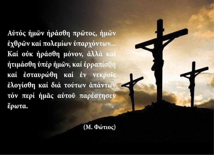 Αὐτός ἡμῶν ἠράσθη πρῶτος, ἡμῶν ἐχθρῶν καί πολεμίων ὑπαρχόντων… Καί οὐκ ἠράσθη μόνον, ἀλλά καί ἠτιμάσθη ὑπέρ ἡμῶν, καί ἐρραπίσθη καί ἐσταυρώθη καί ἐν νεκροῖς ἐλογίσθη καί διά τούτων ἁπάντων…