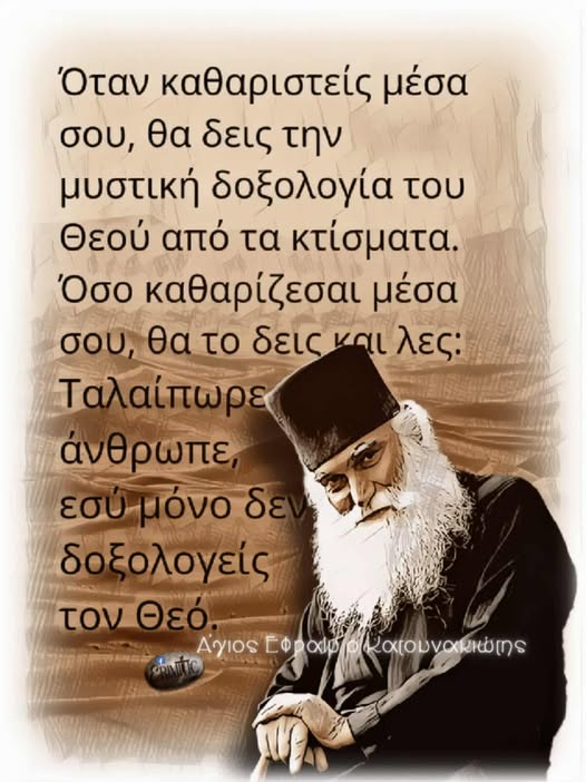 Όταν καθαριστείς μέσα σου, θα δεις την μυστική δοξολογία του Θεού από τα κτίσματα. Όσο καθαρίζεσαι μέσα σου, θα το δεις και λες: Ταλαίπωρε άνθρωπε, εσύ μόνο δεν δοξολογείς