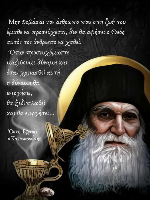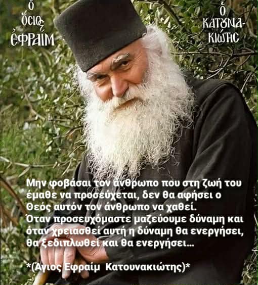 ~ΟΣΙΟΣ ΕΦΡΑΙΜ Ο ΚΑΤΟΥΝΑΚΙΩΤΗΣ: Μην φοβάσαι τον άνθρωπο που στη ζωή του έμαθε να προσεύχεται, δεν θα αφήσει ο Θεός αυτόν τον άνθρωπο να χαθεί.Όταν προσευχόμαστε μαζεύουμε δύναμη και όταν…