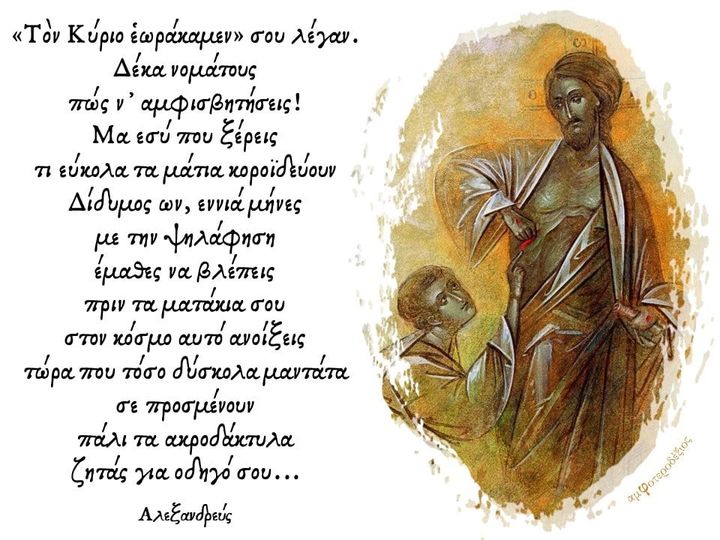 Τὸν Κύριο ἑωράκαμεν» σου λέγαν. Δέκα νομάτους πώς ν’ αμφισβητήσεις!Μα εσύ που ξέρεις τι εύκολα τα μάτια κοροϊδεύουν Δίδυμος ων, εννιά μήνες με την ψηλάφηση έμαθες να βλέπεις πριν τα…
