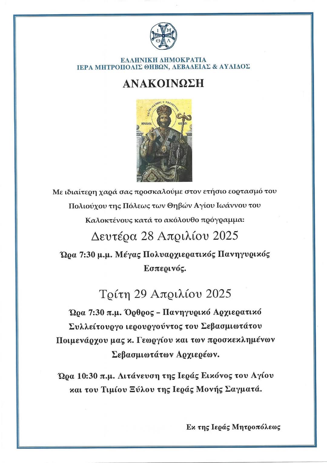 +ΕΟΡΤΙΑ ΜΝΗΜΗ ΤΟΥ ΠΟΛΙΟΥΧΟΥ ΘΗΒΩΝ ΑΓΙΟΥ ΙΩΑΝΝΟΥ ΤΟΥ ΚΑΛΟΚΤΕΝΟΥΣ, ΜΗΤΡΟΠΟΛΙΤΟΥ ΘΗΒΩΝ ΚΑΙ ΕΞΑΡΧΟΥ ΠΑΣΗΣ ΒΟΙΩΤΙΑΣ ΤΟΥ ΝΕΟΥ ΕΛΕΗΜΟΝΟΣ (28 ΚΑΙ 29/4/2025)