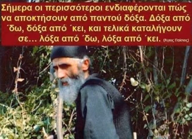 “Σήμερα οι περισσότεροι ενδιαφέρονται πώς να αποκτήσουν από παντού δόξα. Δόξα από ΄δω, δόξα από ‘κει, και τελικά καταλήγουν σε… λόξα από ‘δω, λόξα από ‘κει.” Άγιος Παΐσιος