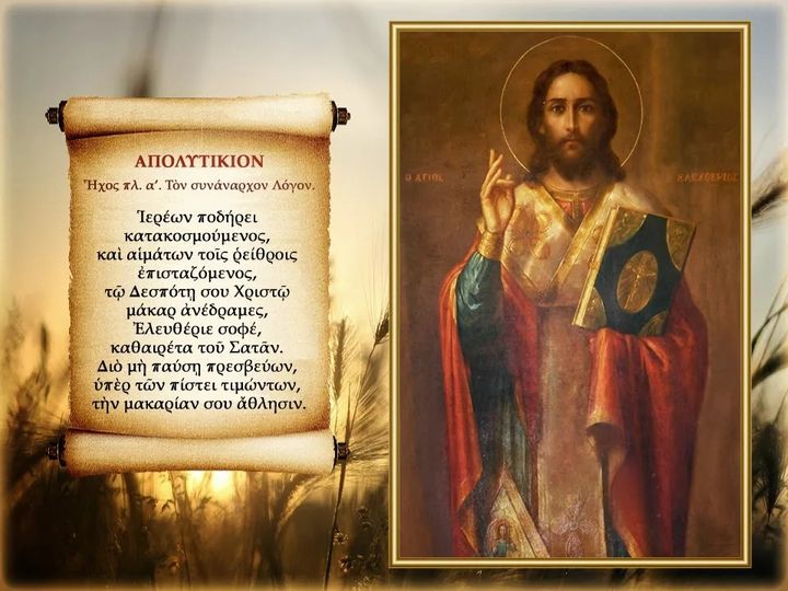 Απολυτίκιο Αγίου Ελευθερίου “Ιερέων ποδήρει κατακοσμούμενος, και αιμάτων τοις ρείθροις επισταζόμενος, τω Δεσπότῃ σου Χριστώ μάκαρ ανέδραμες, Ελευθέριε σοφέ, καθαιρέτα του Σατάν. Διο μη παύσῃ πρεσβεύων, υπὲρ των πίστει τιμώντων,…