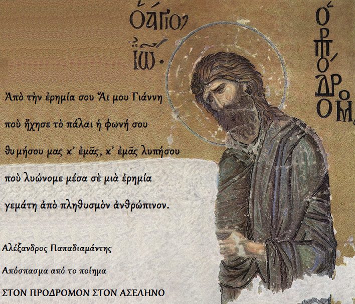 Στον Πρόδρομο στον Ασέληνον (ποίημα Αλέξανδρου Παπαδιαμάντη) Στὸν Πρόδρομον στὸν Ἀσέληνο Πίσω στὸν Ἀσέληνο, στὸ ρέμα ὅπου σταλάζουν τὰ ὅρη γλυκασμὸν καὶ τὸ δάσος ὅλον φαίνεται ἔμψυχον ἀπ’ τὸ πλῆθος…