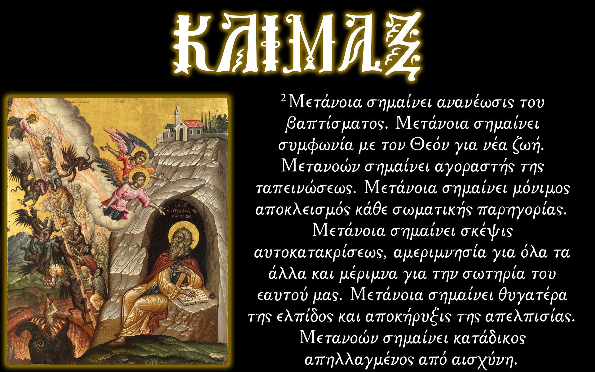 ΑΓΙΟΣ ΙΩΑΝΝΗΣ ΤΗΣ ΚΛΙΜΑΚΟΣ: “ΜΕΤΑΝΟΙΑ”!!! Μετάνοια σημαίνει ανανέωσις του βαπτίσματος.Μετάνοια σημαίνει συμφωνία με το Θεό για μια νέα ζωή.Μετανοών σημαίνει αγοραστής της ταπεινώσεως.Μετάνοια σημαίνει μόνιμος αποκλεισμός κάθε σωματικής παρηγοριάς.