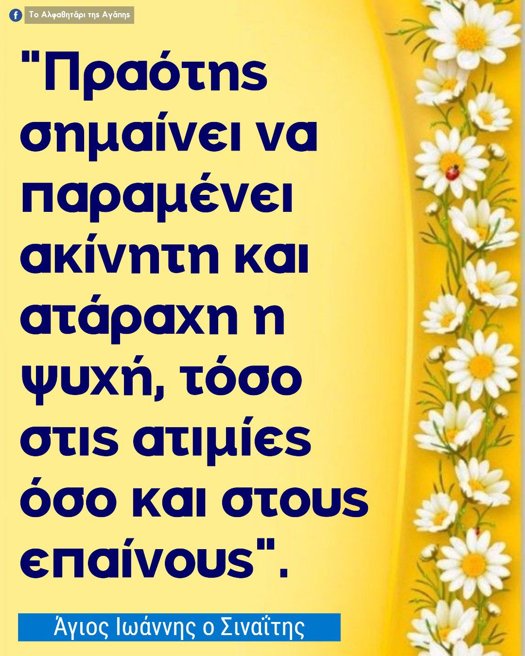 “Πραότης σημαίνει να παραμένει ακίνητη και ατάραχη η ψυχή, τόσο στις ατιμίες όσο και στους επαίνους.” Άγιος Ιωάννης ο Σιναΐτης