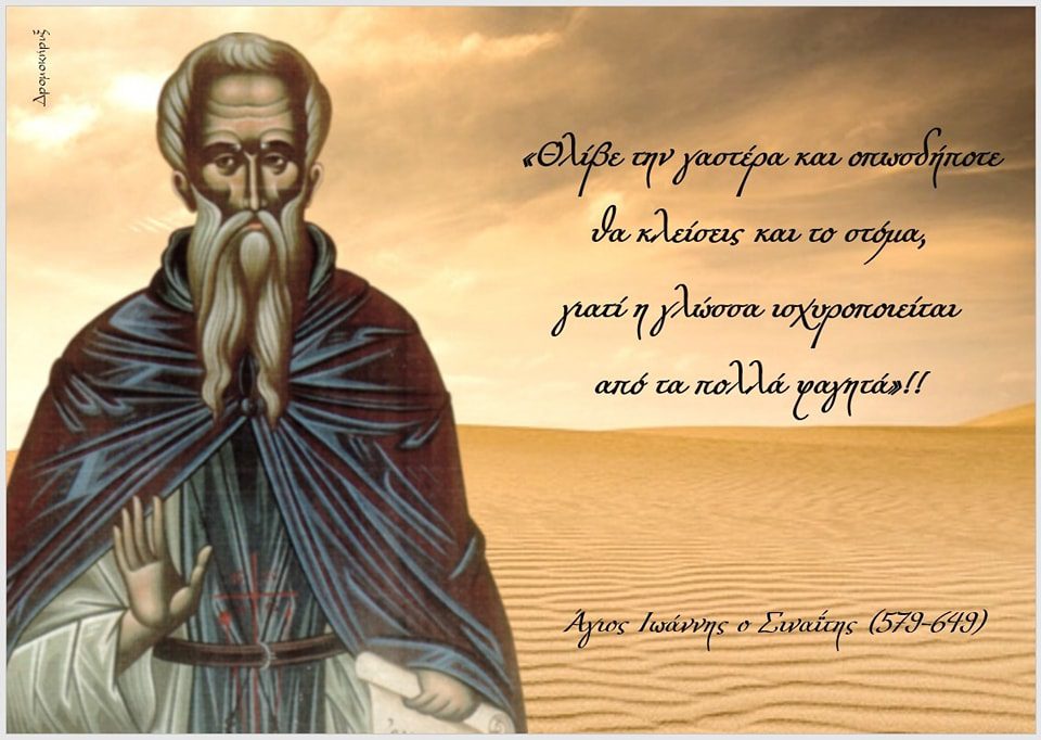«Θλίβε την γαστέρα και οπωσδήποτε θα κλείσεις και το στόμα, γιατί η γλώσσα ισχυροποιείται από τα πολλά φαγητά»Άγιος Ιωάννης ο Σιναΐτης