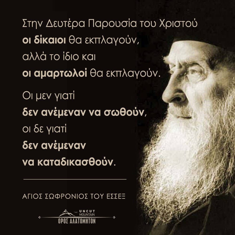 “ΣΤΗ ΔΕΥΤΕΡΑ ΠΑΡΟΥΣΙΑ ΤΟΥ ΧΡΙΣΤΟΥ ΟΙ ΔΙΚΑΙΟΙ ΘΑ ΕΚΠΛΑΓΟΥΝ, ΑΛΛΑ ΤΟ ΙΔΙΟ ΚΑΙ ΟΙ ΑΜΑΡΤΩΛΟΙ ΘΑ ΕΚΠΛΑΓΟΥΝ…” ΑΓΙΟΣ ΣΩΦΡΟΝΙΟΣ ΤΟΥ ΕΣΣΕΞ