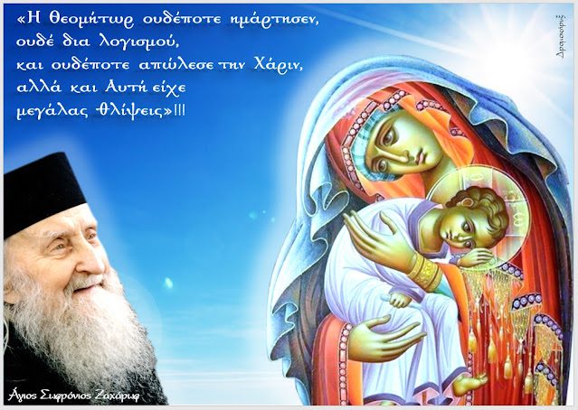 “Η Θεομήτωρ ουδέποτε ημάρτησεν, ουδέ δια λογισμού, και ουδέποτε απώλεσε την χάριν, αλλά και Αυτή είχε μεγάλας θλίψεις. Ότε ίστατο παρά τον Σταυρόν, τότε ως ωκεανός απέραντος ήτο η θλίψις…