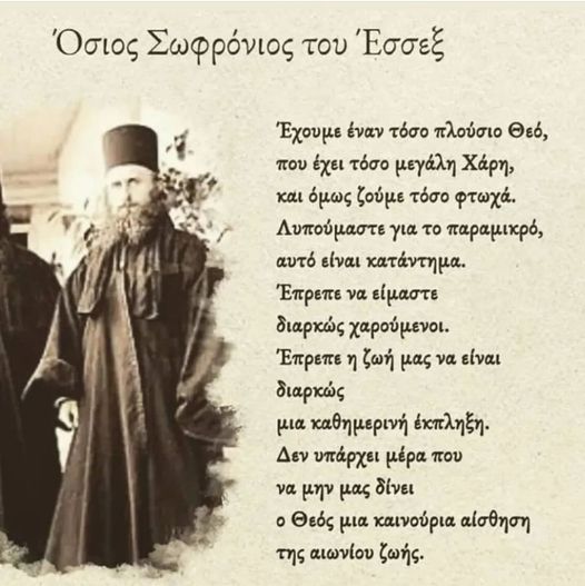 “ΕΧΟΥΜΕ ΕΝΑΝ ΤΟΣΟ ΠΛΟΥΣΙΟ ΘΕΟ ΠΟΥ ΕΧΕΙ ΤΟΣΟ ΜΕΓΑΛΗ ΧΑΡΗ, ΚΑΙ ΟΜΩΣ ΖΟΥΜΕ ΤΟΣΟ ΦΤΩΧΑ…” ΟΣΙΟΣ ΣΩΦΡΟΝΙΟΣ ΤΟΥ ΕΣΣΕΞ