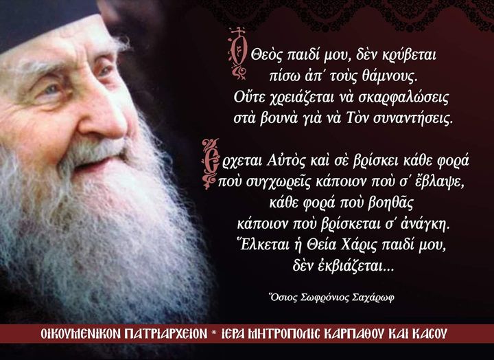Ο Θεὸς παιδί μου, δὲν κρύβεται πίσω ἀπ’ τοὺς θάμνους. Οὔτε χρειάζεται νὰ σκαρφαλώσεις στὰ βουνὰ γιὰ νὰ Τὸν συναντήσεις.Έχεται Αὐτὸς καὶ σὲ βρίσκει κάθε φορά ποὺ συγχωρεῖς κάποιον ποὺ…