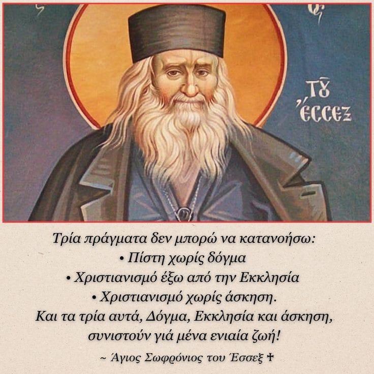 Τρία πράγματα δεν μπορώ να κατανοήσω:-Πίστη χωρίς δόγμα.-Χριστιανισμό έξω από την Εκκλησία.-Χριστιανισμό χωρίς άσκηση.Και τα τρία αυτά, Δόγμα, Εκκλησία και άσκηση, συνιστούν για μένα ενιαία ζωή! ~ Άγιος Σωφρόνιος του…