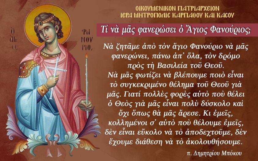 ΤΙ ΝΑ ΖΗΤΑΜΕ ΝΑ ΜΑΣ ΦΑΝΕΡΩΣΕΙ Ο ΑΓΙΟΣ ΦΑΝΟΥΡΙΟΣ; Του π. Δημητρίου Μπόκου. Μεγάλη προθυμία έχουμε για φανουρόπιτες στον άγιο Φανούριο, αλλά μεγάλη απροθυμία για πνευματικό αγώνα κατά των παθών,…