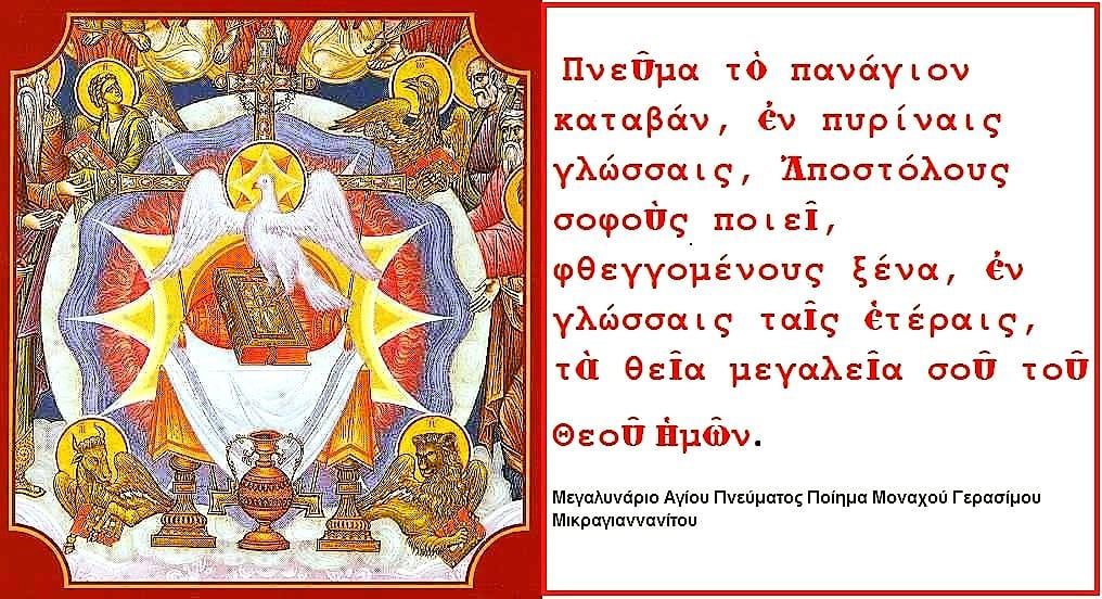 Κάτω από την εικόνα των πυρίνων γλωσσών, η θεία ενέργεια θεοποιεί… ~Θεοφάνης ὁ Κρής Η Πεντηκοστή δεν είναι μια απλή συνέπεια ή συνέχεια της Ενσαρκώσεως. Η Πεντηκοστή έχει όλη την…