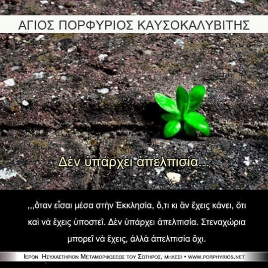 Δὲν ὑπάρχει ἀπελπισία μέσα στὴν Ἐκκλησία, ὅ,τι καὶ νὰ ἔχεις κάνει, ὅ,τι καὶ νὰ ἔχεις ὑποστεῖ. Δὲν ὑπάρχει ἀπελπισία. Στενοχώρια μπορεῖ νὰ ἔχεις, ἀλλὰ ἀπελπισία ὄχι. Ὁ Θεὸς, μέσα ἀπὸ…