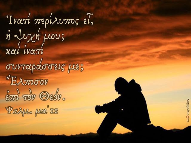 Ἱνατί περίλυπος εἶ, ἡ ψυχή μου; καὶ ἱνατί συνταράσσεις με; ἔλπισον ἐπὶ τὸν Θεόν, ὅτι ἐξομολογήσομαι αὐτῷ· σωτήριον τοῦ προσώπου μου καὶ ὁ Θεός μου. (Γιατί, λοιπόν, είσαι τόσον λυπημένη,…