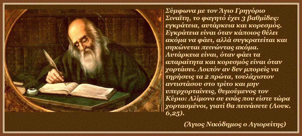 Σύμφωνα με τον Άγιο Γρηγόριο Σιναϊτη, το φαγητό έχει 3 βαθμίδες: εγκράτεια, αυτάρκεια και κορεσμός. Εγκράτεια είναι όταν κάποιος θέλει ακόμα να φάει, αλλά συγκρατείται και σηκώνεται πεινώντας ακόμα. Αυτάρκεια…