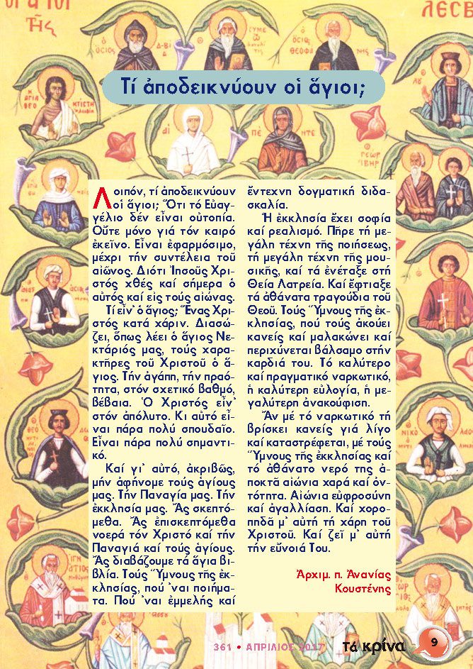 Λοιπόν, τί ἀποδεικνύουν οι άγιοι; Ότι το ευαγγέλιο δέν εἶναι ουτοπία. Οὔτε μόνο γιά τόν καιρό ἐκεῖνο. Εἶναι ἐφαρμόσιμο, μέχρι τήν συντέλεια τοῦ αιώνος. Διότι Ιησούς Χριστός χθές καί σήμερα…