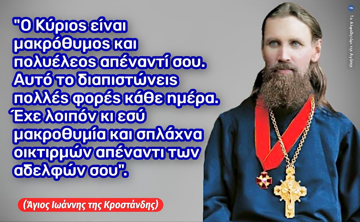 “Ο Κύριος είναι μακρόθυμος και πολυέλεος απέναντί σου. Αυτό το διαπιστώνεις πολλές φορές κάθε ημέρα. Έχε λοιπόν κι εσύ μακροθυμία και σπλάχνα οικτιρμών απέναντι των αδελφών σου”(Άγιος Ιωάννης της Κροστάνδης)