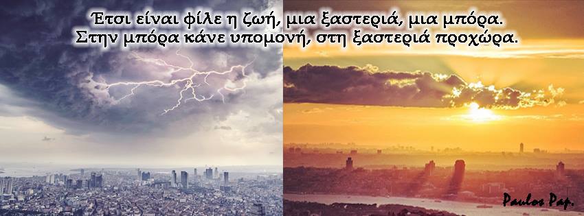 Έτσι είναι φίλε η ζωή, μια ξαστεριά, μια μπόρα. Στην μπόρα κάνε υπομονή, στη ξαστεριά προχώρα.