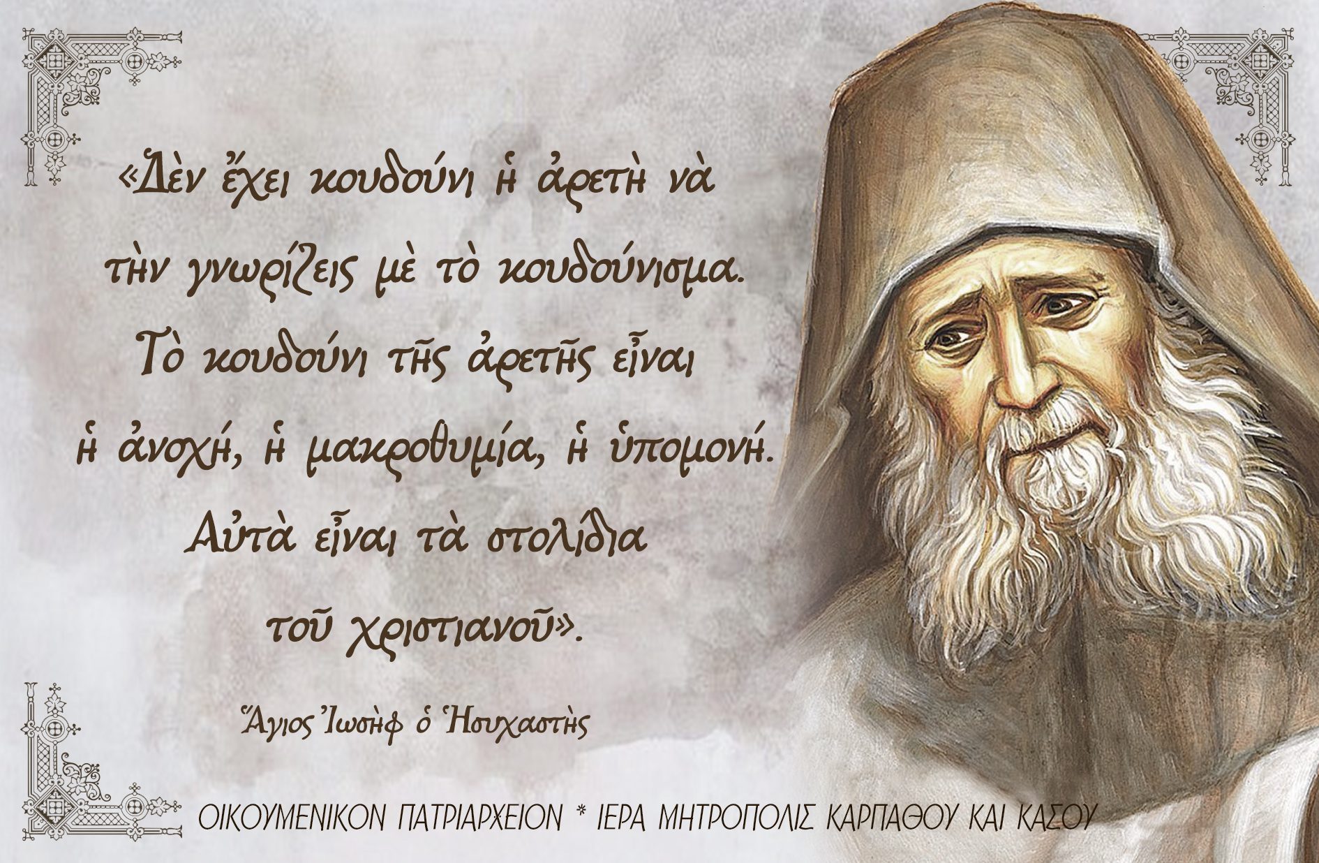 «Δὲν ἔχει κουδούνι ἡ ἀρετὴ νὰ τὴν γνωρίζεις μὲ τὸ κουδούνισμα.Τὸ κουδούνι τῆς ἀρετῆς εἶναι ἡ ἀνοχή, ἡ μακροθυμία, ἡ ὑπομονή.Αὐτὰ εἶναι τὰ στολίδια τοῦ χριστιανοῦ».Ἅγιος Ἰωσὴφ ὁ Ἡσυχαστής