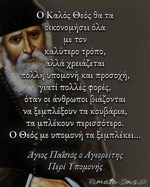 Ο Καλός Θεός θα τα οικονομήσει όλα με τον καλύτερο τρόπο,αλλά χρειάζεται πολλή υπομονή και προσοχή,γιατί πολλές φορές,όταν οι άνθρωποι βιάζονται να ξεμπλέξουν τα κουβάρια,τα μπλέκουν περισσότερο.Ο Θεός με υπομονή…