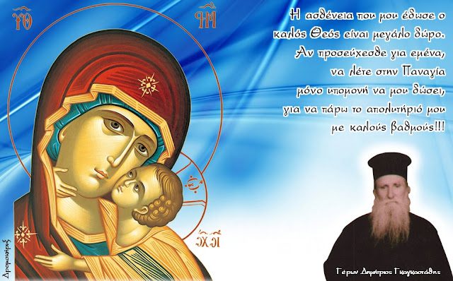 “Η ασθένεια που μου έδωσε ο καλός Θεός είναι μεγάλο δώρο.Αν προσεύχεσθε για εμένα, να λέτε στην Παναγία μόνο υπομονή να μου δώσει, για να πάρω το απολυτήριό μου με
