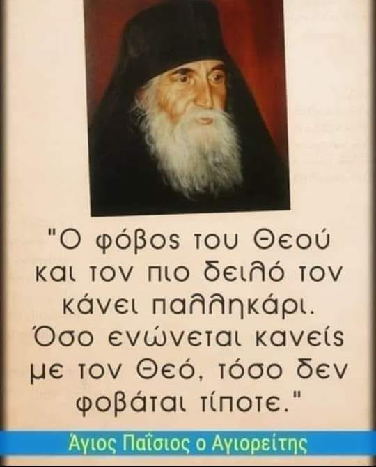 “Ο φόβος του Θεού και τον πιο δειλό τον κάνει παλληκάρι. Όσο ενώνεται κανείς με τον Θεό, τόσο δεν φοβάται τίποτε.”Άγιος Παΐσιος ο Αγιορείτης