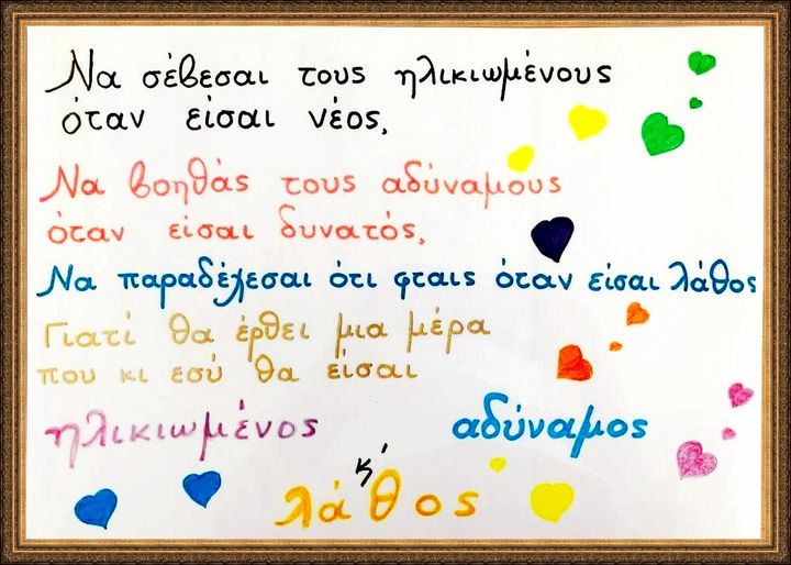 Να σέ­βε­σαι τους ηλι­κιω­μέ­νους, όταν εί­σαι νέος… Να βο­η­θάς τους αδύ­να­μους, όταν εί­σαι δυ­να­τός… Να πα­ρα­δέ­χε­σαι ότι φταις, όταν εί­σαι λά­θος… Για­τί θα έρ­θει μια μέρα, που κι εσύ θα…